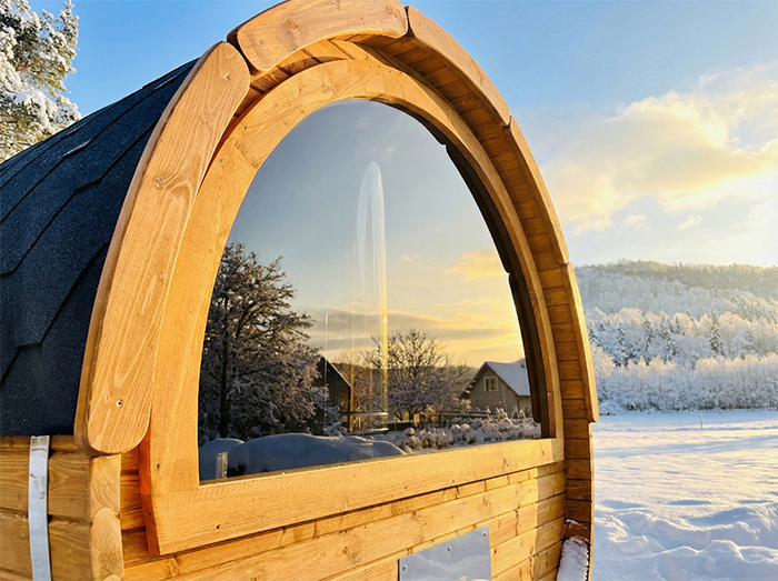 Genieße die volle Aussicht während deines Saunagangs. Das große Panoramafenster lässt den Innenraum optisch verschmelzen mit der Natur und sorgt für ein Gefühl von Freiheit und Weite.