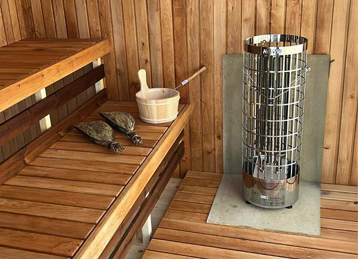 - Ofen: Harvia Saunaofen zur Wahl (Holz- oder Elektroofen)